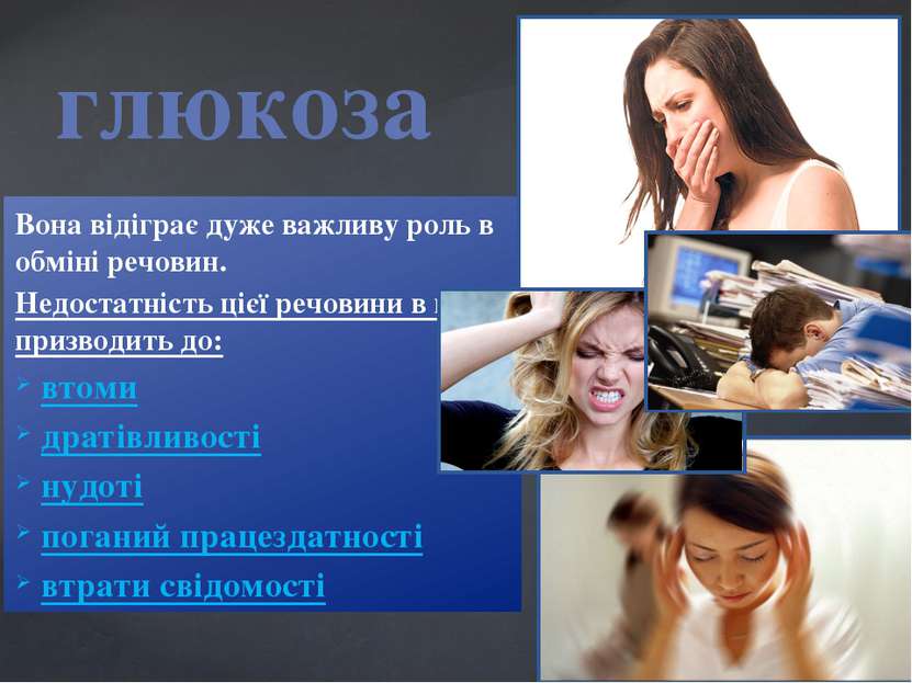 Вона відіграє дуже важливу роль в обміні речовин. Недостатність цієї речовини в крові призводить до: втоми дратівливості нудоті поганий працездатності втрати свідомості глюкоза