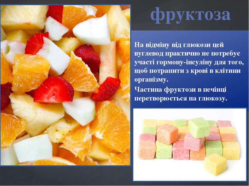 На відміну від глюкози цей вуглевод практично не потребує участі гормону-інсуліну для того, щоб потрапити з крові в клітини організму. Частина фруктози в печінці перетворюється на глюкозу. фруктоза