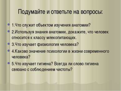 Подумайте и ответьте на вопросы: 1.Что служит объектом изучения анатомии? 2.Используя знания анатомии, докажите, что человек относится к классу млекопитающих. 3.Что изучает физиология человека? 4.Каково значение психологии в жизни современного человека? 5.Что изучает гигиена? Всегда ли слово гигиена связано с соблюдением чистоты?