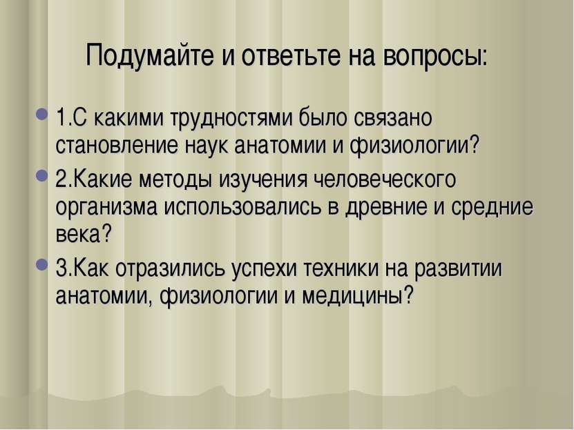 Подумайте и ответьте на вопросы: 1.С какими трудностями было связано становление наук анатомии и физиологии? 2.Какие методы изучения человеческого организма использовались в древние и средние века? 3.Как отразились успехи техники на развитии анатомии, физиологии и медицины?
