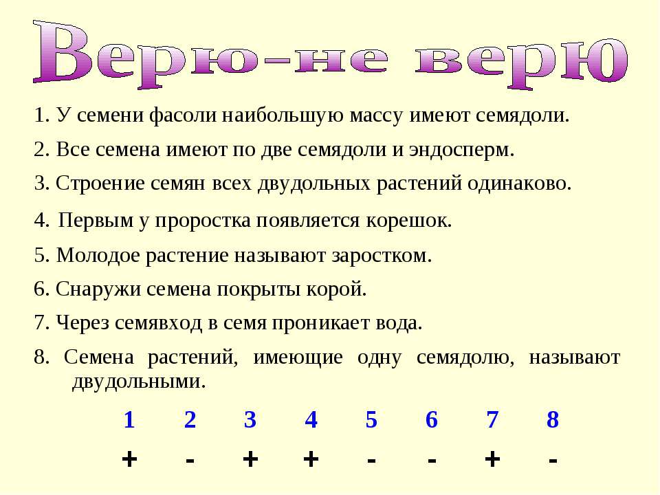 1. У семени фасоли наибольшую массу имеют семядоли. 2. Все семена имеют по две семядоли и эндосперм. 3. Строение семян всех двудольных растений одинаково. 4. Первым у проростка появляется корешок. 5. Молодое растение называют заростком. 6. Снаружи семена покрыты корой. 7. Через семявход в семя проникает вода. 8. Семена растений, имеющие одну семядолю, называют двудольными. 1 2 3 4 5 6 7 8 + - + + - - + -