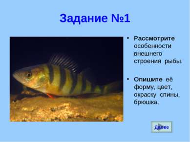 Задание №1 Рассмотрите особенности внешнего строения рыбы. Опишите её форму, цвет, окраску спины, брюшка. Далее