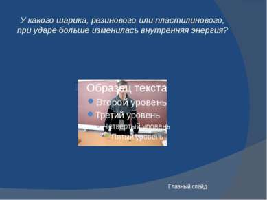 У какого шарика, резинового или пластилинового, при ударе больше изменилась внутренняя энергия? Главный слайд
