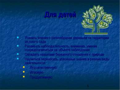 Для детей Усвоить знания о разнообразии деревьев на территории детского сада Развивать наблюдательность, внимание, умение сосредотачиваться на объекте наблюдения Овладеть навыками бережного отношения к природе Научиться переносить усвоенные знания в разные виды деятельности: Художественную Игровую Продуктивную
