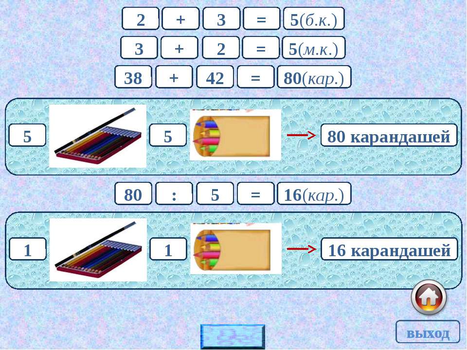 2 + 3 = 5(б.к.) 3 + 2 = 5(м.к.) 38 + 42 = 80(кар.) й 1 16 карандашей 1 5 80 карандашей 5 80 : 5 = 16(кар.) выход