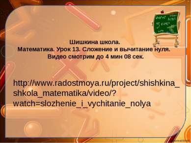 Шишкина школа. Математика. Урок 13. Сложение и вычитание нуля. Видео смотрим до 4 мин 08 сек. http://www.radostmoya.ru/project/shishkina_shkola_matematika/video/?watch=slozhenie_i_vychitanie_nolya Ekaterina050466