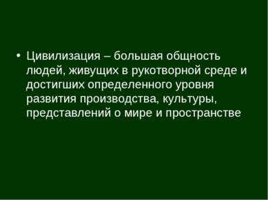 Цивилизация – большая общность людей, живущих в рукотворной среде и достигших определенного уровня развития производства, культуры, представлений о мире и пространстве