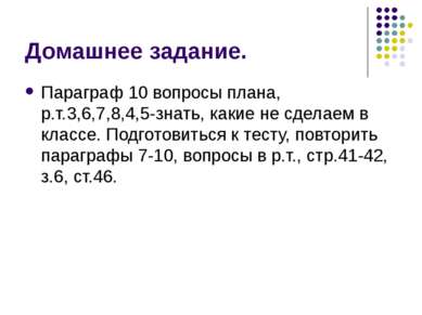 Домашнее задание. Параграф 10 вопросы плана, р.т.3,6,7,8,4,5-знать, какие не сделаем в классе. Подготовиться к тесту, повторить параграфы 7-10, вопросы в р.т., стр.41-42, з.6, ст.46.
