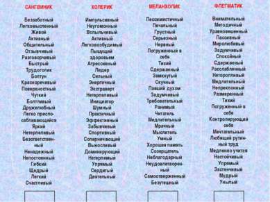 САНГВИНИК Беззаботный Легкомысленный Живой Активный Общительный Отзывчивый Разговорчивый Быстрый Трудоголик Болтун Красноречивый Поверхностный Чуткий Болтливый Дружелюбный Легко приспо- сабливающийся Яркий Нетерпеливый Безответствен- ный Ненадежный Непостоянный Гибкий Щедрый Легкий Счастливый ХОЛЕРИК Импульсивный Неугомонный Вспыльчивый Активный Легковозбудимый Пышущий здоровьем Агрессивный Лидер Сильный Энергичный Экстраверт Нетерпеливый Инициатор Шумный Практичный Эффективный Забывчивый Спортивный Соперничающий Выносливый Доминирующий Нетерпимый Упрямый Сердитый Деятельный МЕЛАНХОЛИК Пессимистичный Печальный Грустный Серьезный Нервный Погруженный в себя Тихий Сдержанный Замкнутый Скучный Павший духом Задумчивый Требовательный Ранимый Читатель Медлительный Мрачный Мыслитель Умный Хорошая память Созерцатель Неблагодарный Неудовлетворен- ный Самоотверженный Безутешный ФЛЕГМАТИК Внимательный Методичный Уравновешенный Пассивный Миролюбивый Задумчивый Спокойный Сдержанный Расслабленный Неторопливый Медлительный Непреклонный Размеренный Тихий Погруженный в себя Контролирующий себя Мечтательный Любящий рутин- ный труд Медленно учится Настойчивый Упрямый Застенчивый Мудрый Унылый