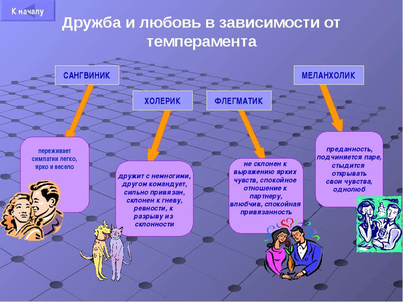 Дружба и любовь в зависимости от темперамента ФЛЕГМАТИК ХОЛЕРИК МЕЛАНХОЛИК САНГВИНИК дружит с немногими, другом командует, сильно привязан, склонен к гневу, ревности, к разрыву из склонности переживает симпатии легко, ярко и весело не склонен к выражению ярких чувств, спокойное отношение к партнеру, влюбчив, спокойная привязанность преданность, подчиняется паре, стыдится открывать свои чувства, однолюб К началу
