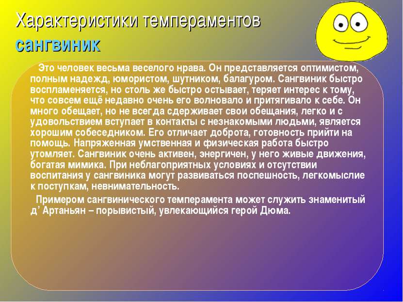 Характеристики темпераментов сангвиник Это человек весьма веселого нрава. Он представляется оптимистом, полным надежд, юмористом, шутником, балагуром. Сангвиник быстро воспламеняется, но столь же быстро остывает, теряет интерес к тому, что совсем ещё недавно очень его волновало и притягивало к себе. Он много обещает, но не всегда сдерживает свои обещания, легко и с удовольствием вступает в контакты с незнакомыми людьми, является хорошим собеседником. Его отличает доброта, готовность прийти на помощь. Напряженная умственная и физическая работа быстро утомляет. Сангвиник очень активен, энергичен, у него живые движения, богатая мимика. При неблагоприятных условиях и отсутствии воспитания у сангвиника могут развиваться поспешность, легкомыслие к поступкам, невнимательность. Примером сангвинического темперамента может служить знаменитый д’ Артаньян – порывистый, увлекающийся герой Дюма.