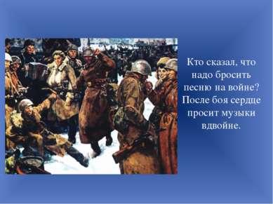 Кто сказал, что надо бросить песню на войне? После боя сердце просит музыки в... Кто сказал, что надо бросить песню на войне? После боя сердце просит музыки вдвойне.